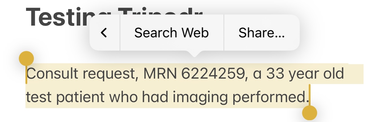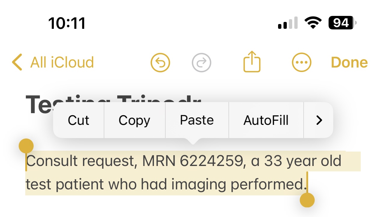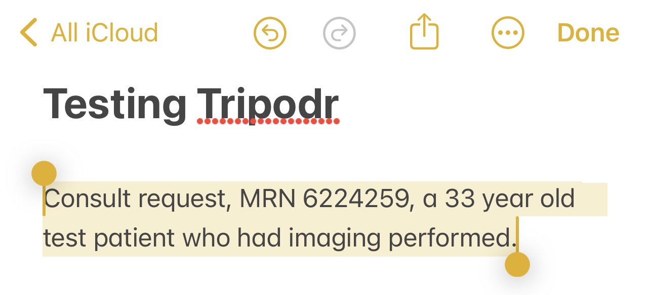 Tripodr will work from shared notes, emails, PDFs, and WhatsApp messages. It will also work from photos of PACS viewers, facesheets, Spok pages, patient labels, and wristbands. Not all apps provide an interface for directly sharing to Tripodr, but you can always take a screenshot.